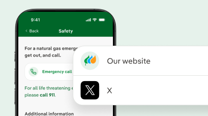 If you are ever in a natural gas emergency, find a safe location and contact us through the app. You can also easily access our Support page to get the help you need.